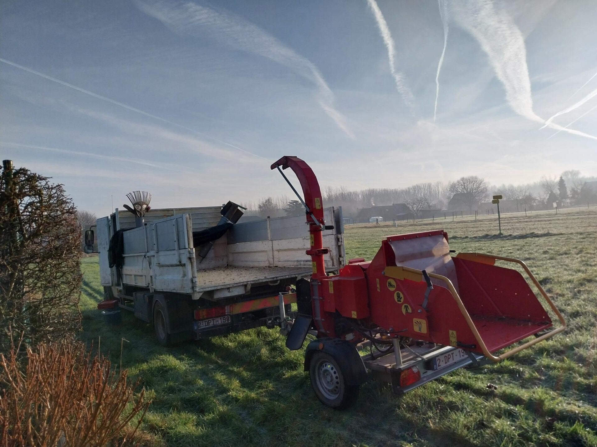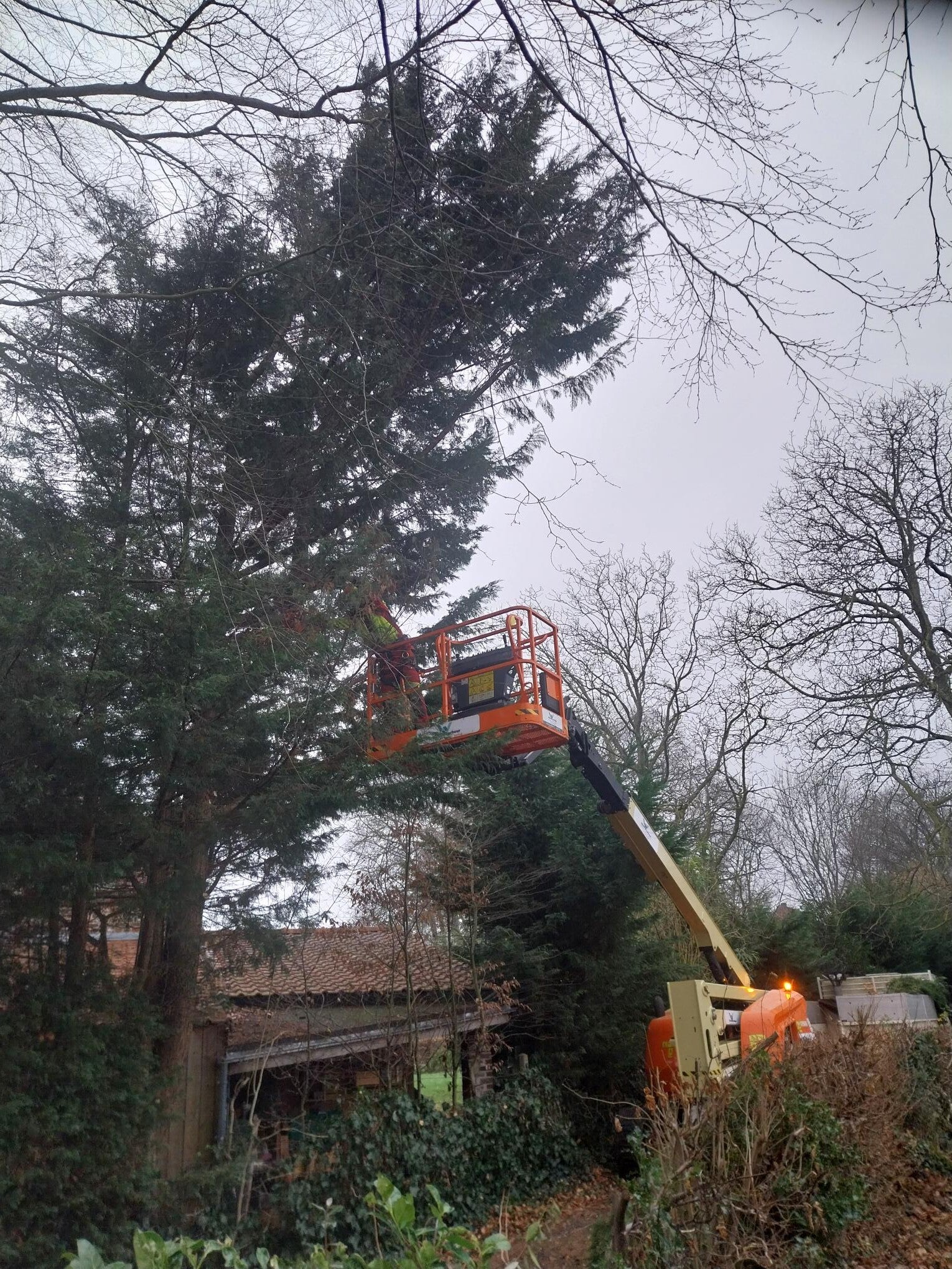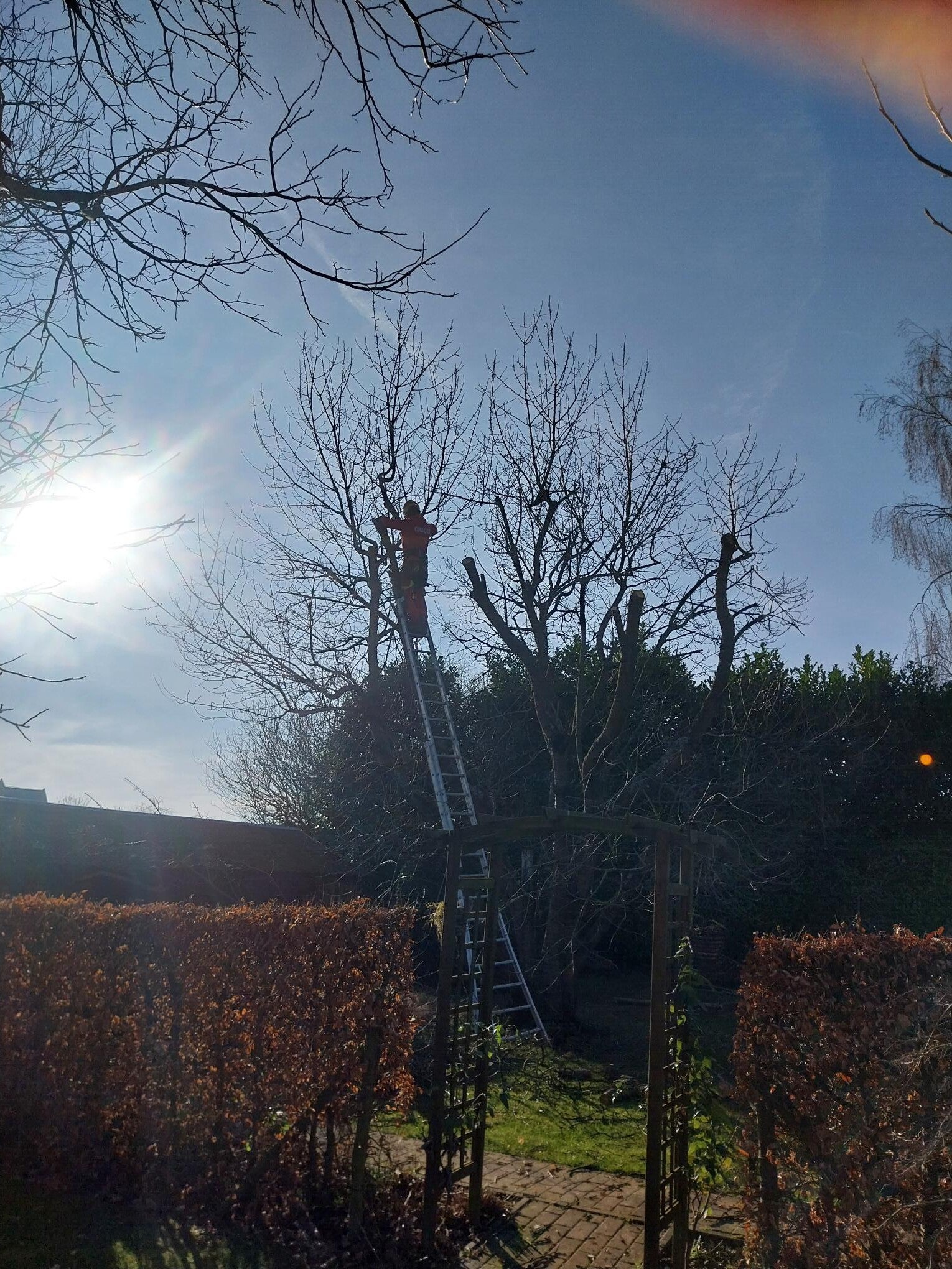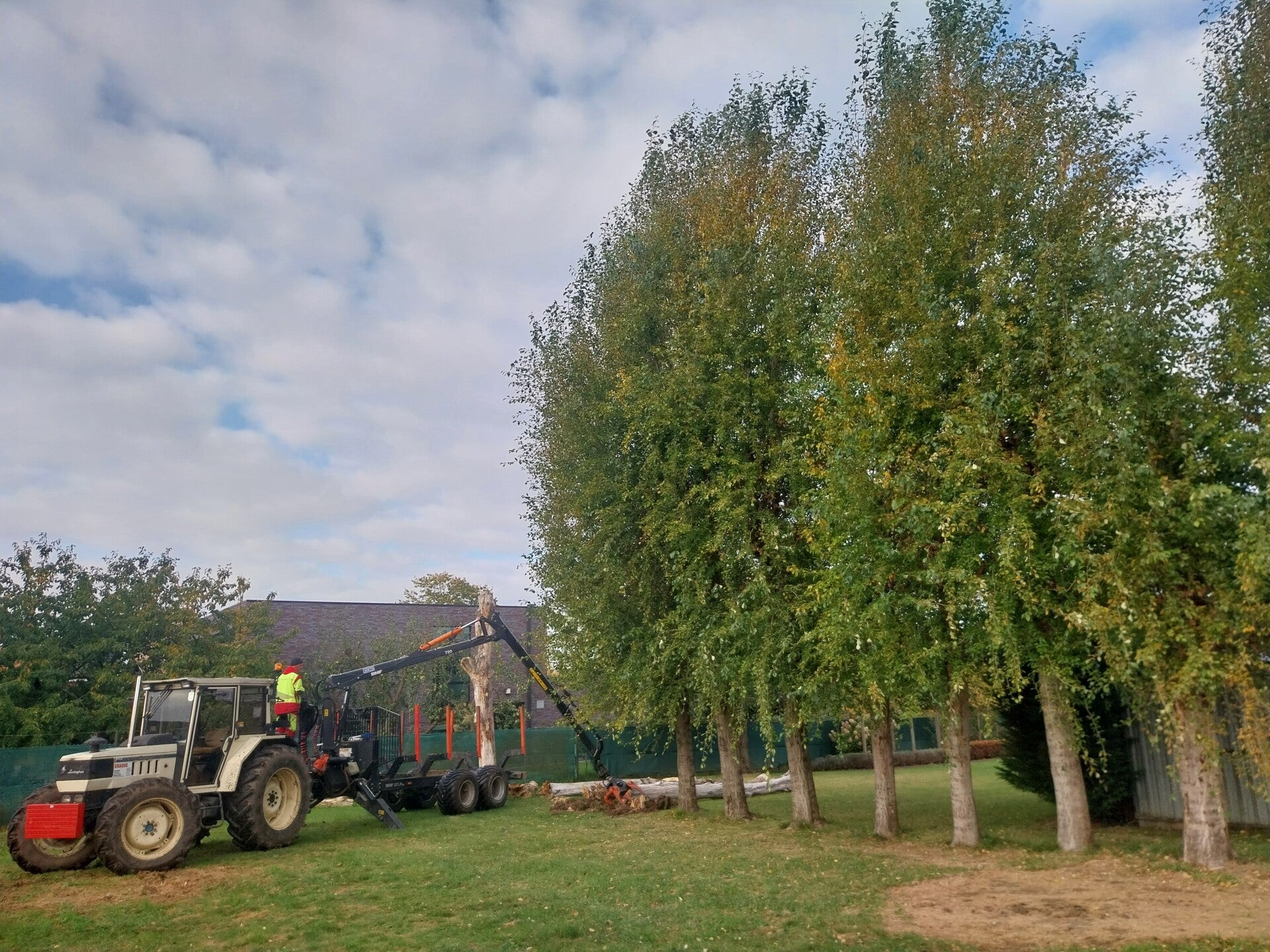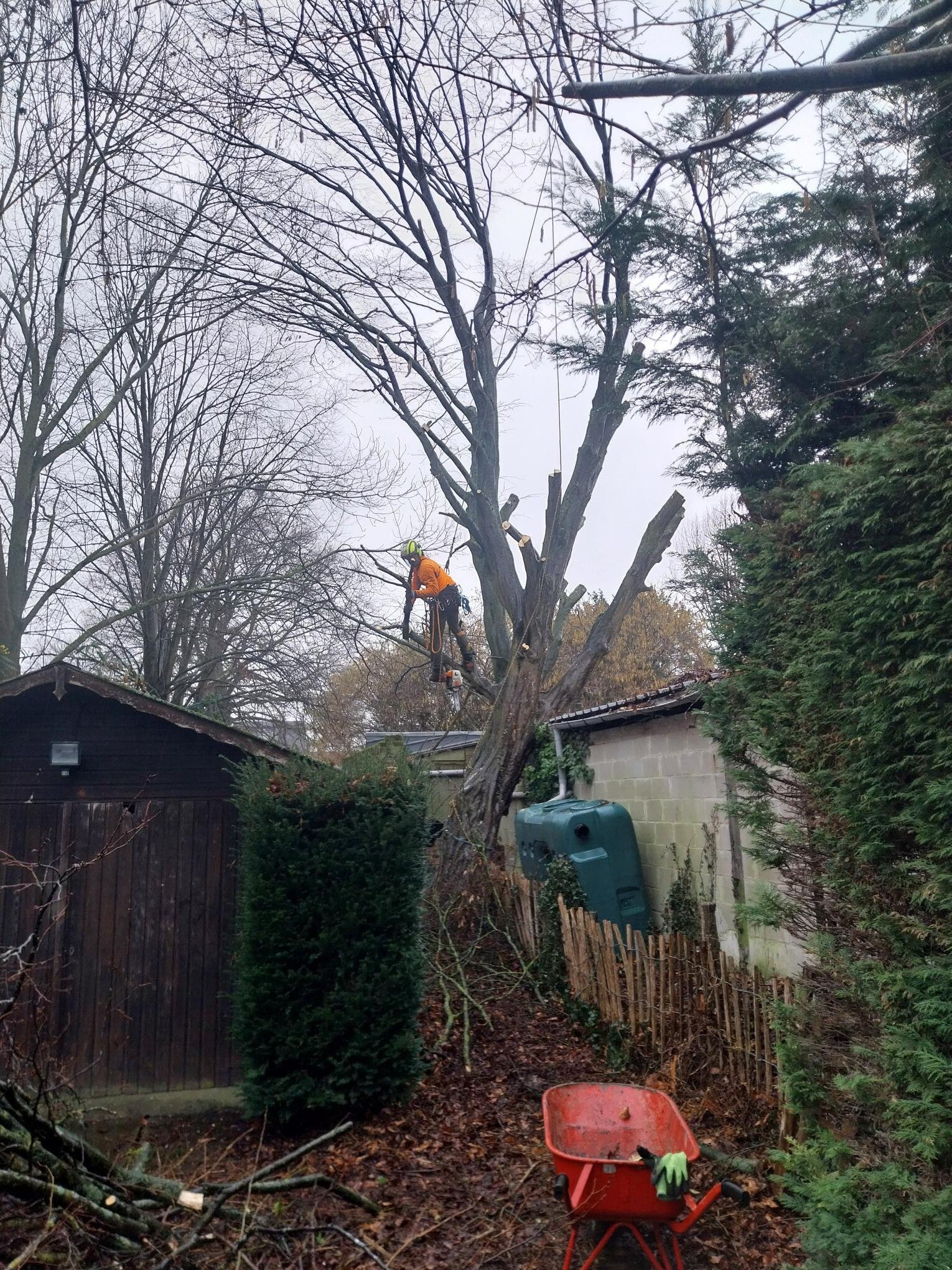 Bij Jean : 2 dode sparren vellen, serieus snoeien & houtwal maken.